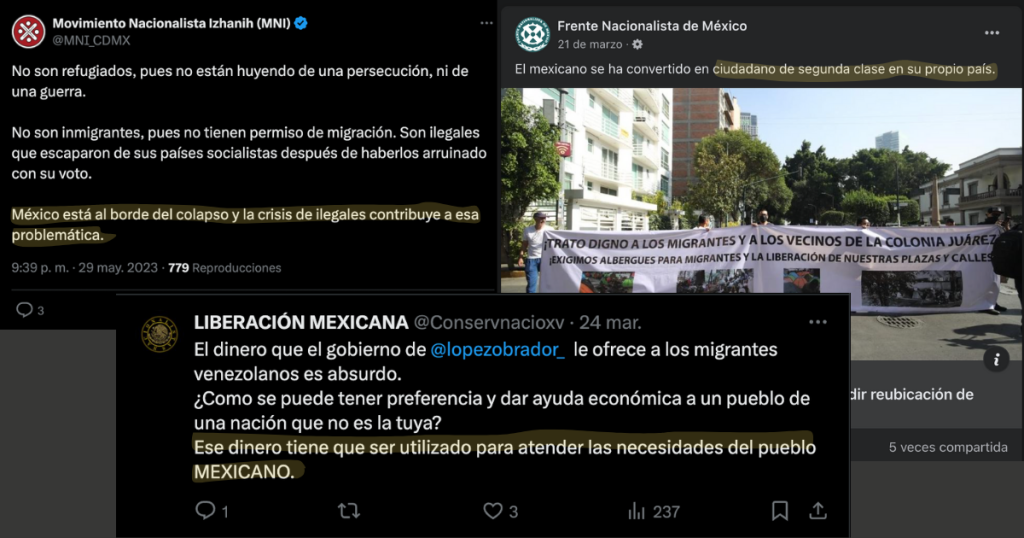 Otra narrativa compartida por grupos nacionalistas es que “México está al borde del colapso económico” y las personas migrantes solo empeoran la situación del país al recibir apoyo y asistencia social que “tiene que ser utilizada para atender las necesidades del pueblo mexicano”.