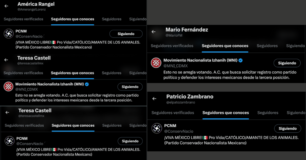Por ejemplo, las legisladoras del PAN, Teresa Castell y América Rangel, así como el diputado federal electo de Movimiento Ciudadano, Mario Fernández, tienen como parte de su red de seguidores, al menos a un partido nacionalista y los tres personajes han hecho comentarios antimigrantes en el pasado.