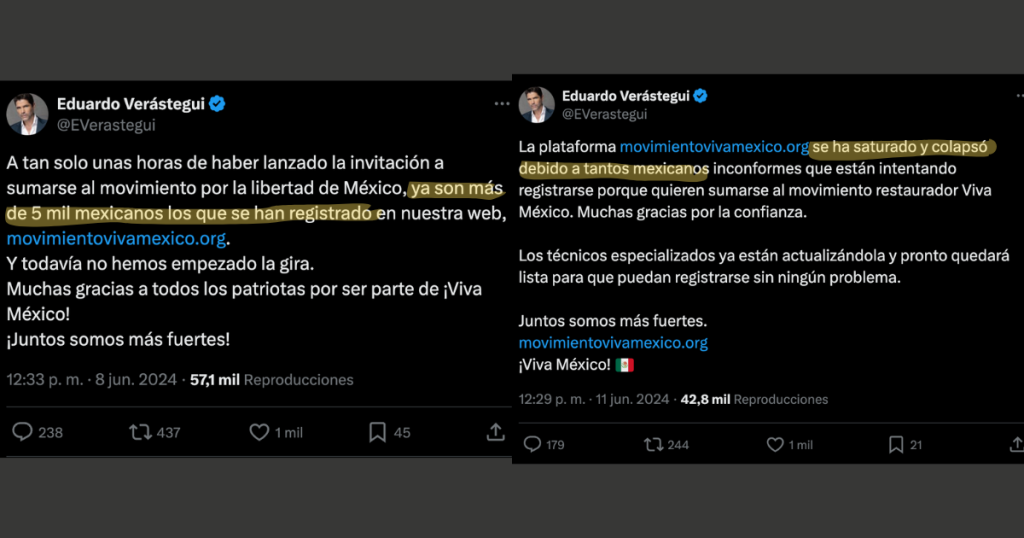 Si bien, no es posible saber cuántas personas se han registrado hasta el momento, el exactor y productor señaló en su cuenta personal de X que tras un día de lanzamiento, el movimiento Viva México contaba ya con 5 mil suscriptores y que había colapsado la plataforma por exceso de demandas. Es notorio decir que a la fecha de publicación de este reportaje, la información dicha por Verástegui no ha podido ser corroborada.