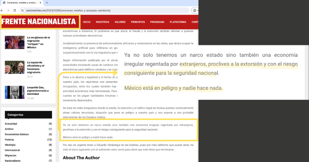 Usando sus perfiles de redes sociales y canales de difusión, organizaciones civiles con ideología nacionalista de extrema derecha comparten desinformación y discurso de odio antiinmigrante y LGBTodiante.